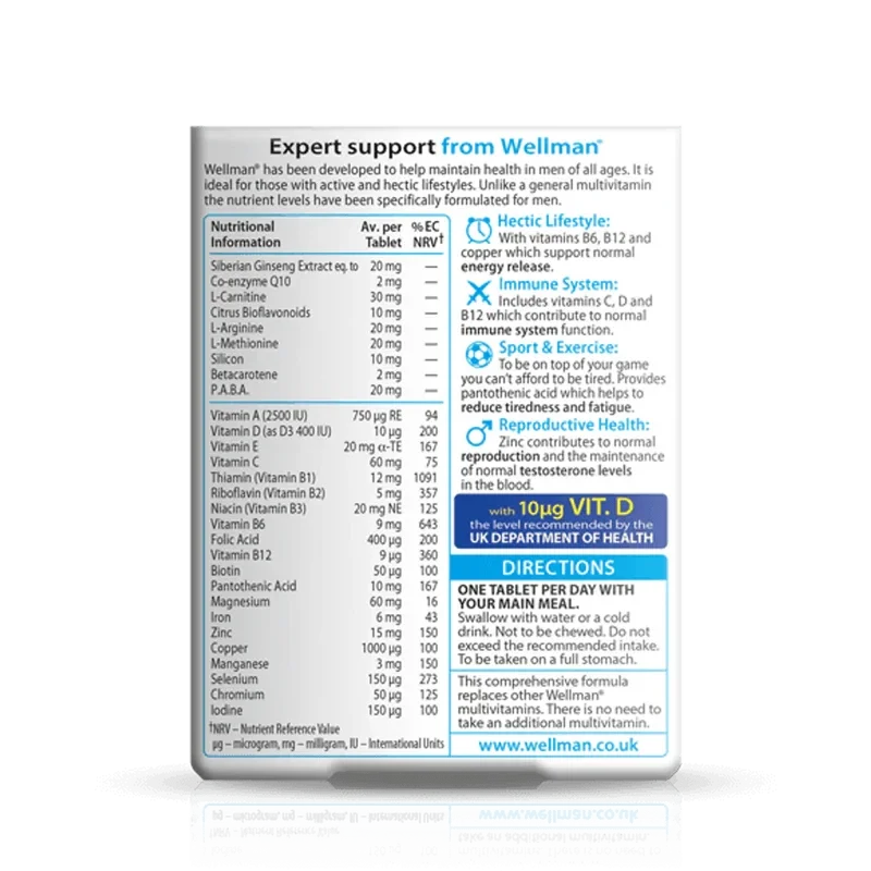 Vitabiotics Wellman 30 Tablets are specially formulated multivitamins for men, supporting health and vitality with 29 nutrients including vitamins A, C, D, B6, B12, and zinc. Ideal for active lifestyles, it helps reduce tiredness and supports immune function and reproductive health.